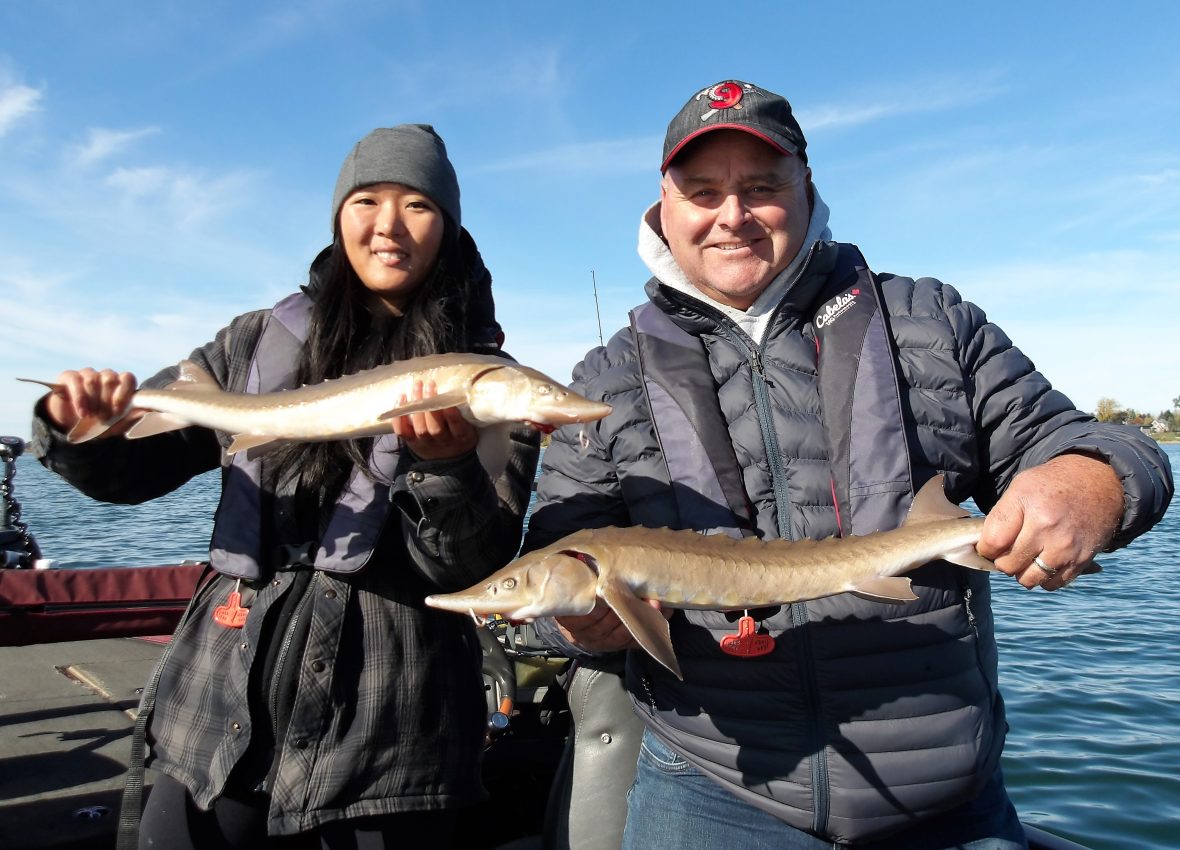 I checked several areas with limited marks before finally getting the lines wet. Sarah was given the first rod and she boated her very first sturgeon. Although still a juvenile, it was nice to see. We hit another area after some time and managed to get several more with everyone catching them. We even managed a double as Sarah and her dad landed a small one at the same time.