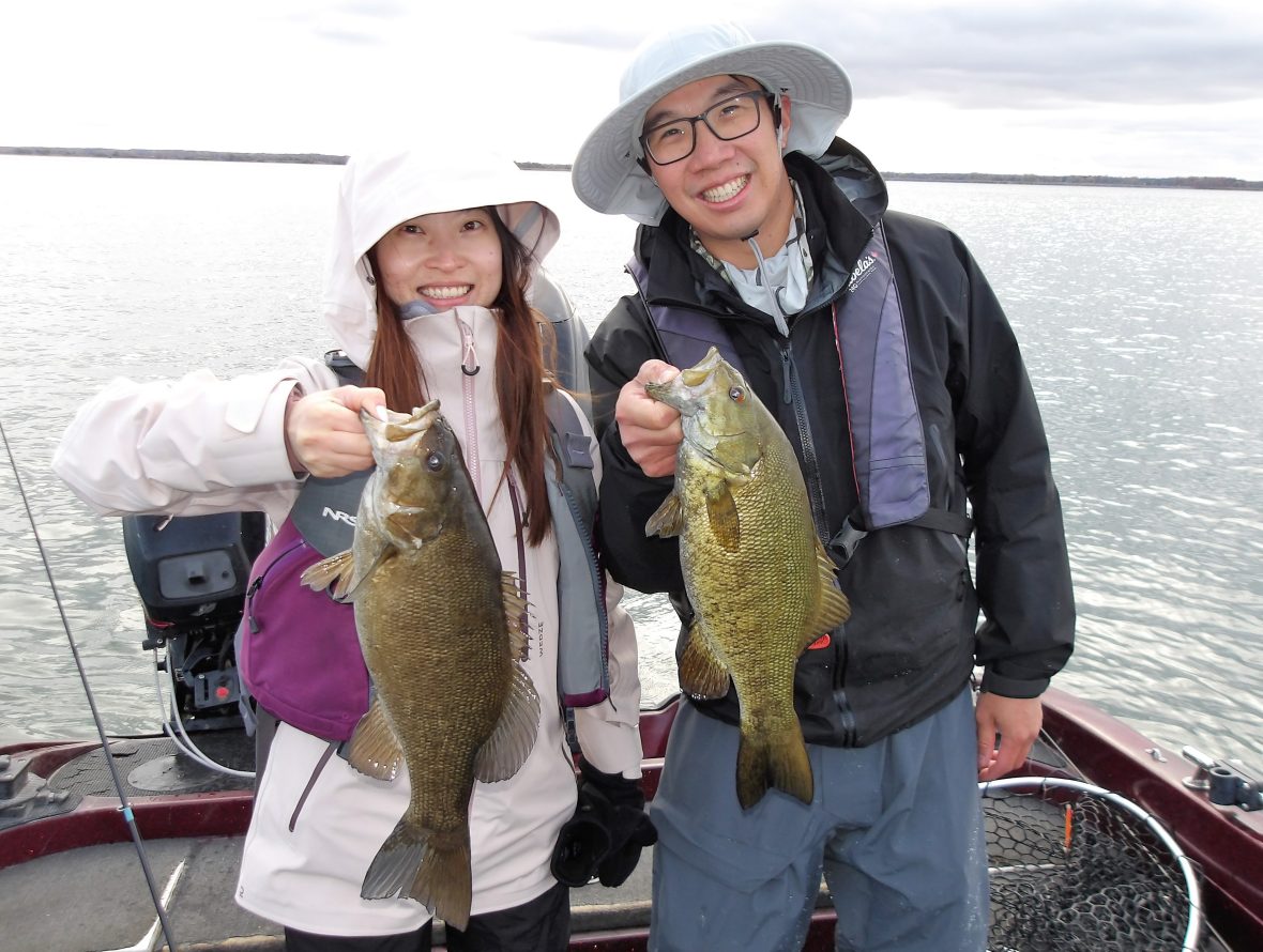 Today was a typical fall trip with tough fishing at the start and better fishing in the afternoon. The cold morning gave way to warmer temps eventually and the bass became more active by afternoon. The NW winds didn’t help either as they were blowing big when we began, making it much tougher for boat control as well. Overall, they managed to work through it and were rewarded with great fishing in the end. A tough but excellent outing once again!!