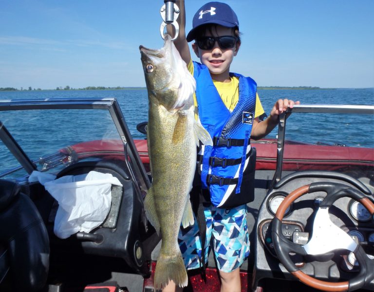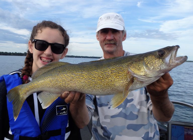 After travelling a good distance in a light chop, I set up the rods and began the troll. It had been so good lately that there was no reason not to. Thomas had caught both pike & walleye before but his daughter was new to this fishing and had not. Within minutes of the lines being set, a reel fired and she had her first Canadian walleye. Not only was it her first, but it was much bigger than anything her father had ever landed before! I held it for her while several pics were taken and then released it back to the water. Nice starter fish!