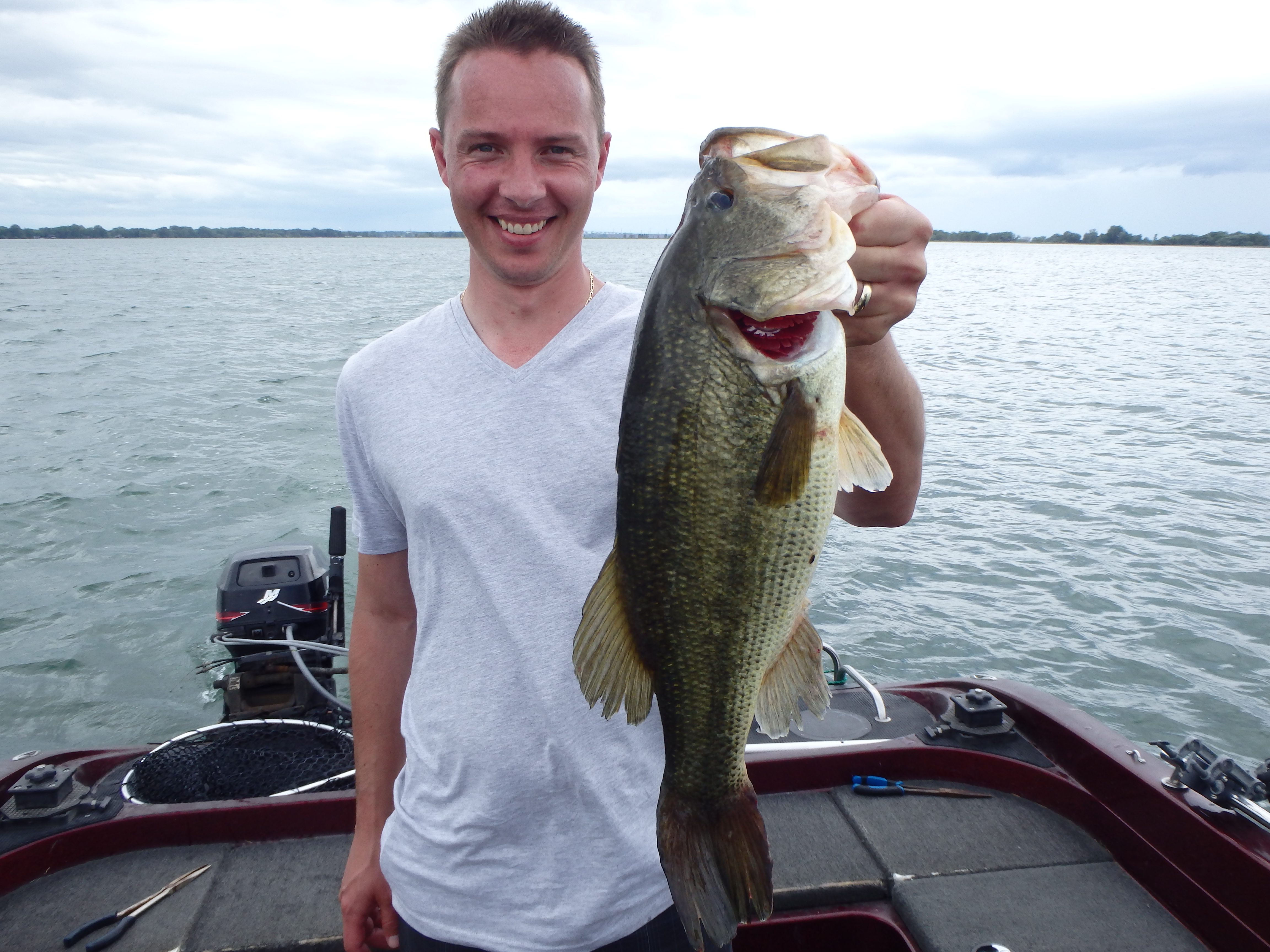 After countless fish throughout the morning, the overcast skies finally gave way to some sunshine in the afternoon. This also helped the fishing somewhat as they were finally able to put a couple of keeper walleye in the livewell for their dinner tonight. Along with these walleye, they still continued catching much bigger ones too and Cameron completed his slam by landing a huge largemouth bass as well. He had never seen one other than in magazines and on TV and was really happy to finally catch one this size. While trying to take pics of his fish, we had a little fire drill with multiple rods going off. So much so that I had to put the largie in the livewell, just to net all the fish they were catching. Each time I managed to get the lines back in, another reel fired and I had to wait again. Nobody seemed to mind as they caught 6 more fish in about 5 minutes time! Eventually I was finally able to take a few pics and he released the bass afterwards.