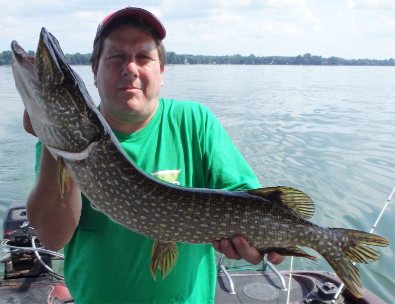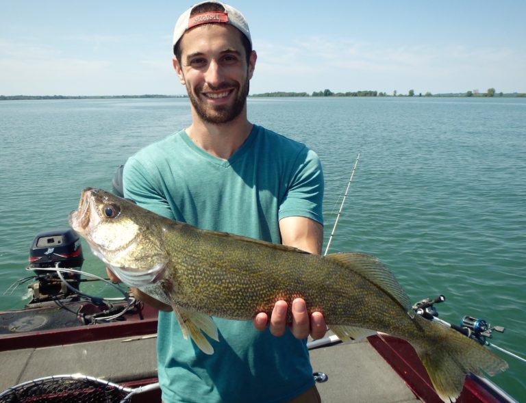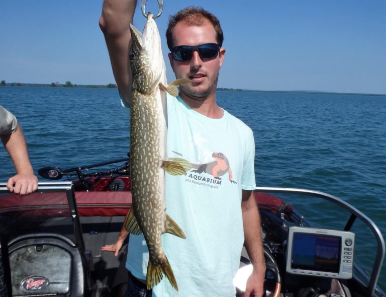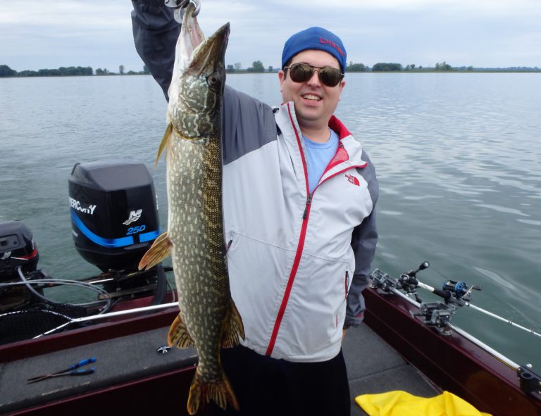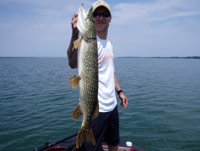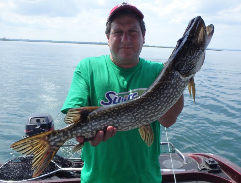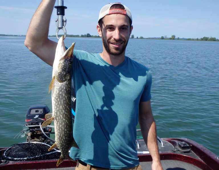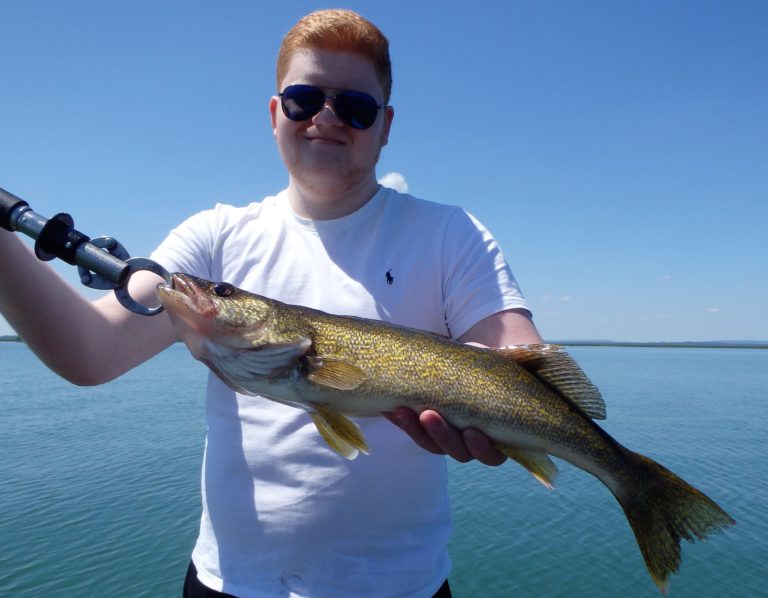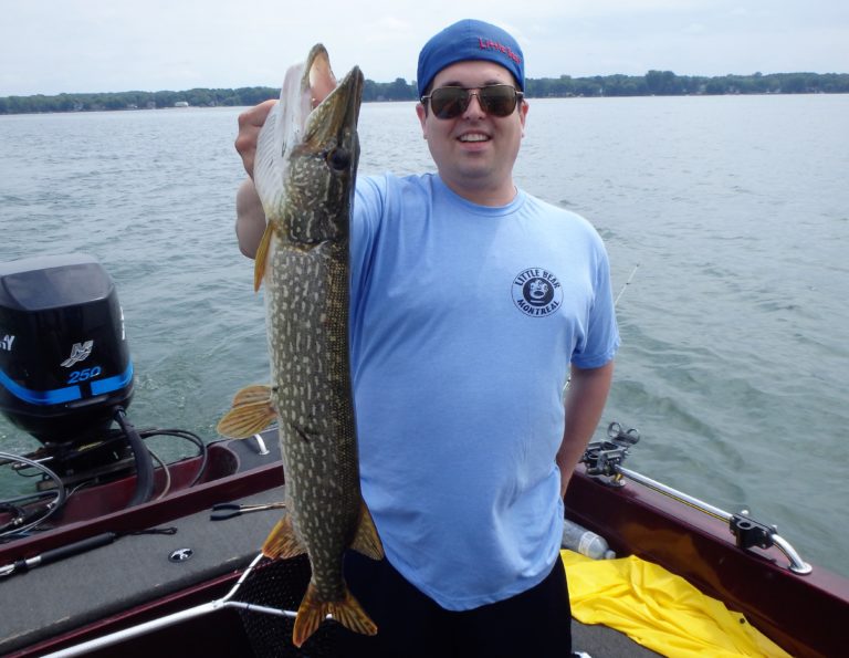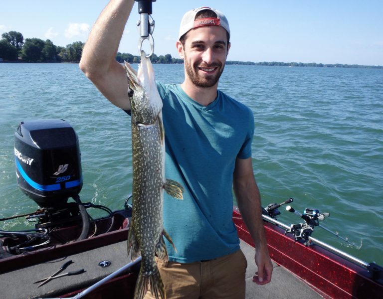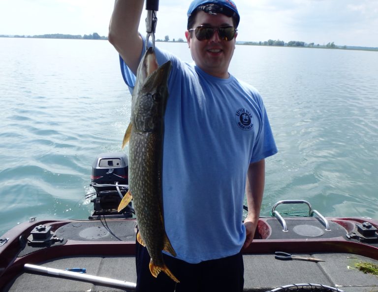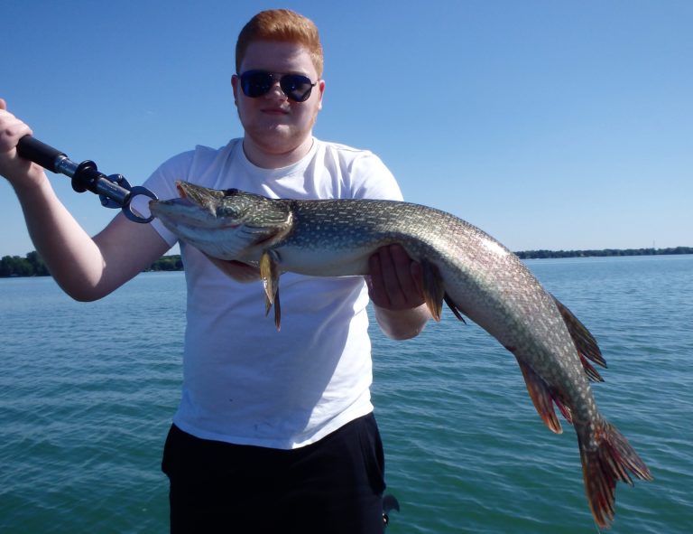 After setting the lines and giving them an orientation, I began the search. It didn’t happen as fast as I had hoped, but eventually, one of the reels went off and Dylan landed a small northern. Definitely not what I had expected, but at least we were bit! As I continued along, I realized that the fish weren’t very active and hoped it would change, soon. Although they did land a few more pike and we had a couple of drive byes, the action just wasn’t there. I worked all the areas both deep and shallow but only picked at the fish for the first couple of hours. Things were going to have to change soon, or we were going to have to relocate!