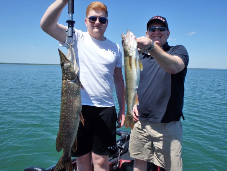 With lines all set, the next bite turned into a double and Noah & his dad battled another couple of great fish. A little chaos occurred when their fish crossed lines, but I was able to untangle them by switching their sides. Two nets were needed for this landing and Adam passed me the second one just in time. Both fish were really good ones and the pike was overly large for this lake. It made for a great pic too!