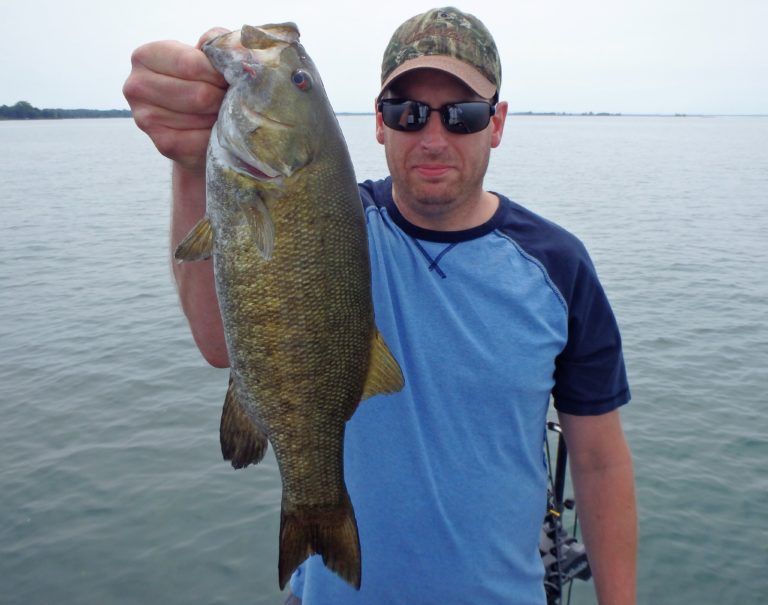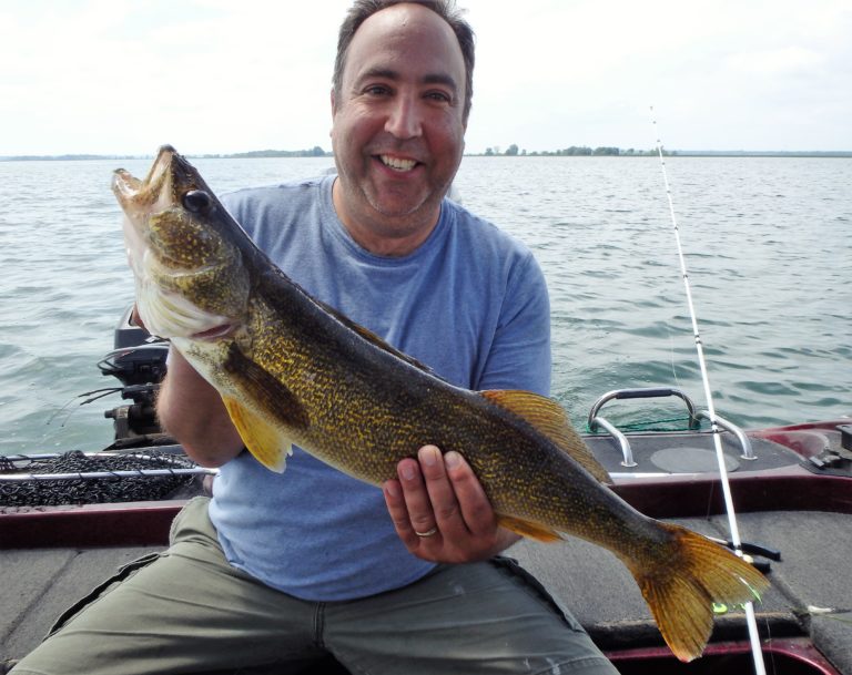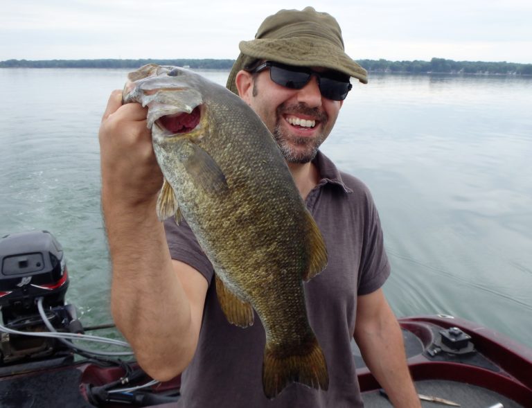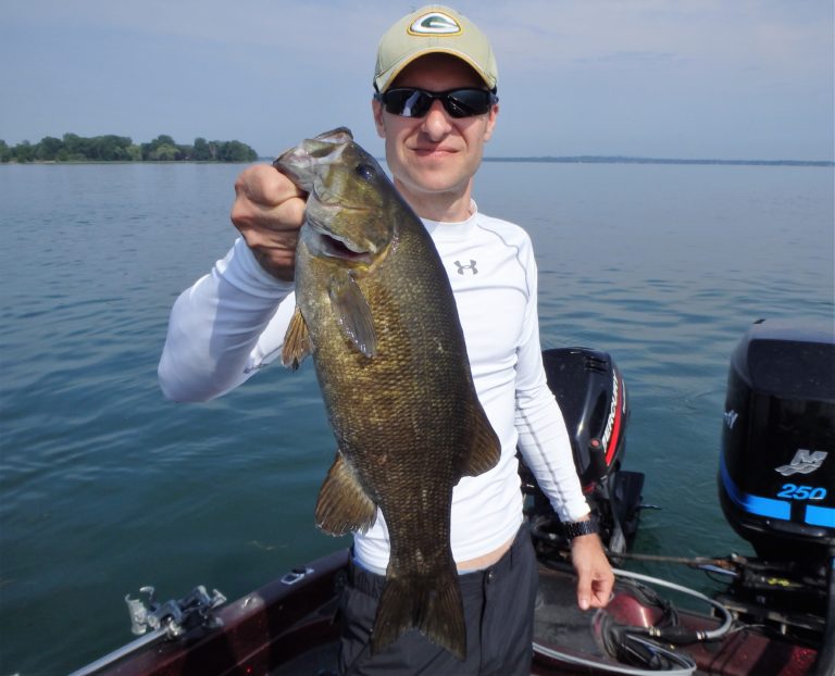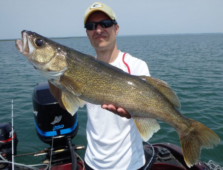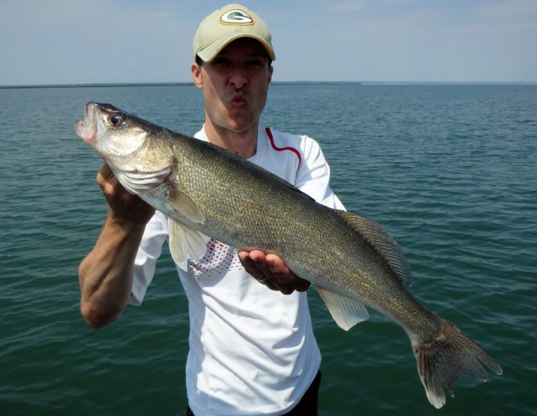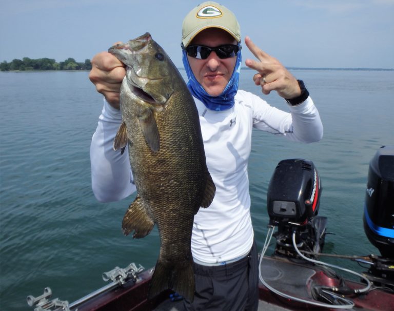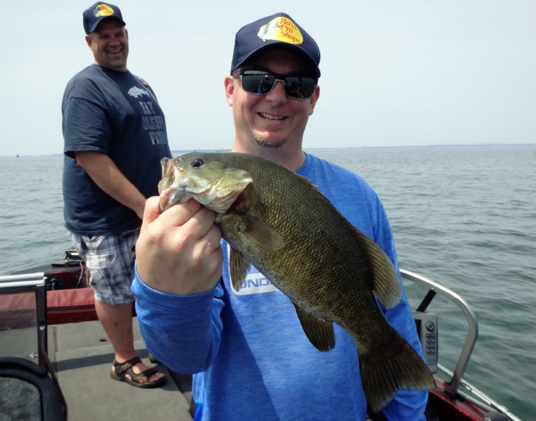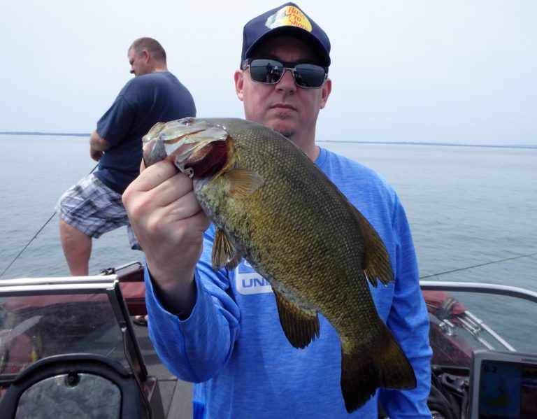 I set up the bimini top as soon as we arrived, so as not to get fried. The sun was high & strong and I knew they would get burned if I didn’t! On the first drift, Adam hooked up on a nice smallie and his father, a small walleye. Things were looking good for the start, but unfortunately that was about to change. We made 4 more drifts over different sections without a single fish coming to the net. It wasn’t for lack of bites as they all had multiple chances. These fish just weren’t cooperating very well and I decided to make an adjustment. We were going trolling and I was in search of big fish!