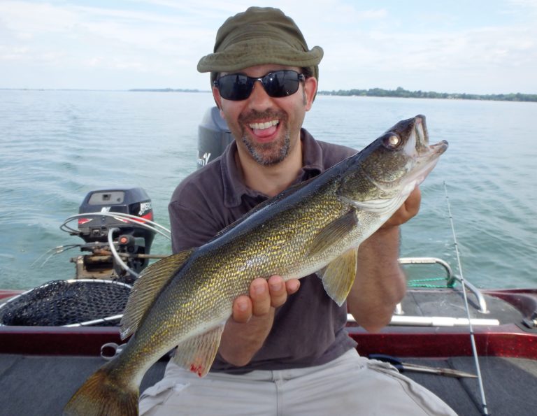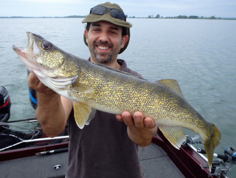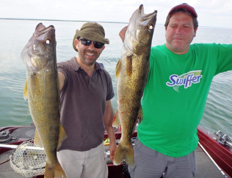 As the morning passed the clouds started to give way to the sun and other boats also arrived. It even got to a point where I had to put the top up due to the high heat & humidity. We had lost any wind we had earlier and needed to be in the shade! I’m not quite sure what the other boats were doing but it definitely wasn’t catching. I think in the total time I only saw 2 or 3 fish boated. We on the other hand put a beating on the fish right through the day. Laurence even managed to fight a couple of nice smallmouth bass that made his day too! Pike after pike and walleye after walleye were being caught and there wasn’t very much down time in between fish. They had several doubles and one almost triple during the day as well. In fact one of the doubles in the afternoon turned out to be a pair of big eyes that made for a great pic before the release. This day was just about perfect!