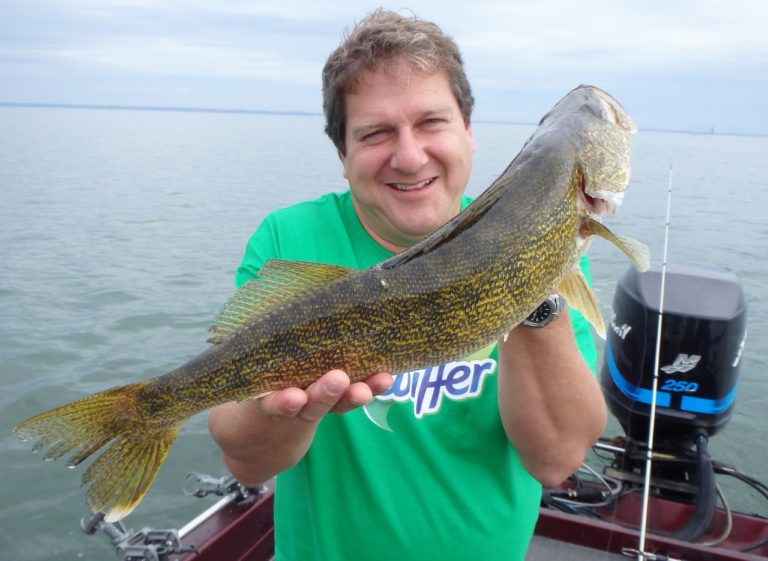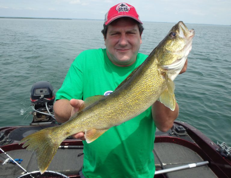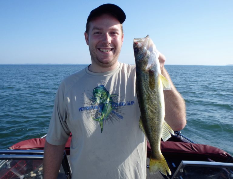 Several more pike were taken before we finally had a good rip on one of the reels. I could tell by the way the fish was staying down that this was the right species. By the looks of the fight, it was also large! As Patrick brought it closer to the boat I realized just how big it really was. It was a giant! Fortunately it had eaten the lure good and stayed pinned all the way into the net. I told him that this was without a doubt the largest walleye brought aboard my boat this season! It was also his personal best making it that much sweeter! Needless to say, we were going to take several pics before releasing her and I took shots from a few different angles. He had the pleasure of putting this sow back and she swam away unharmed! We had finally gotten the one fish I was searching for and I was glad we made the move!