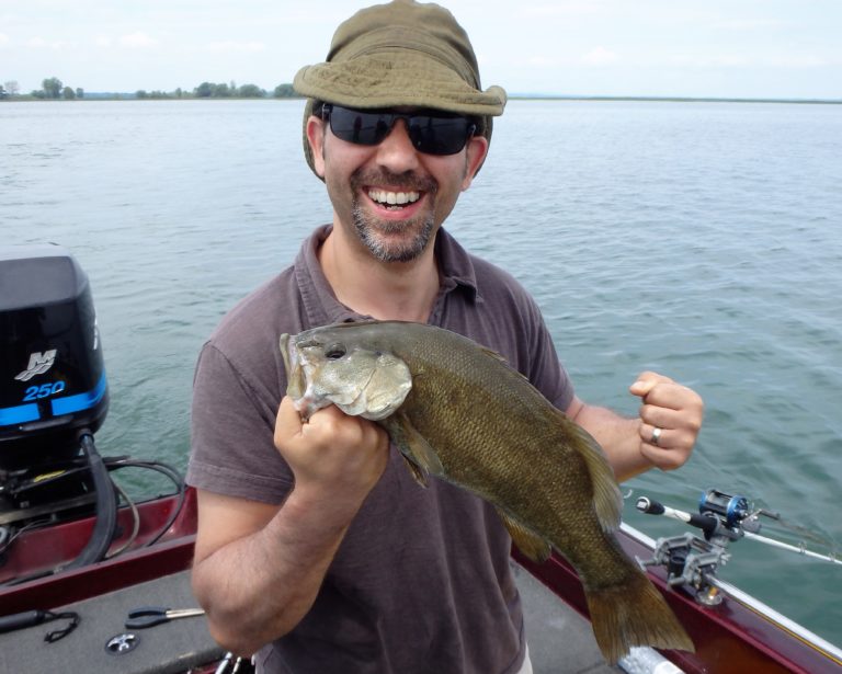 I had Chris up front with me, as I slid into the area I knew held fish. He casted out and while reeling in, had a boil on his bait, but missed the fish. I told him to wait and sure enough, the fish hit again and he was locked up with his first ever smallmouth bass. Never having had the opportunity to fish for these, he was thrilled to watch them go airborne and fight so hard. Although not huge, it was his first and now he wanted more!