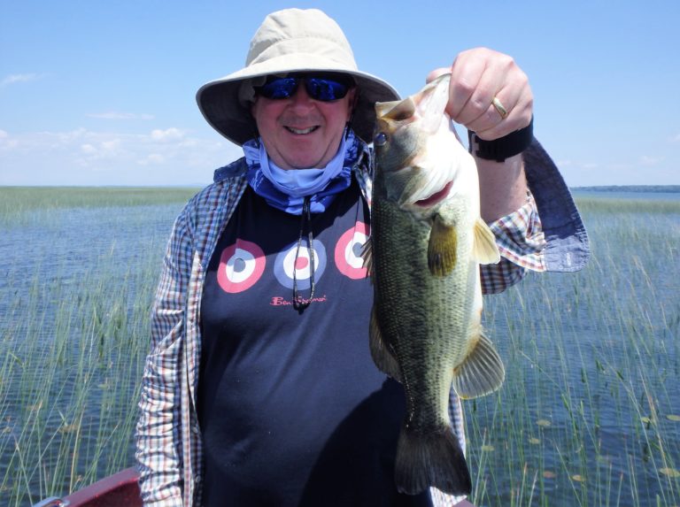 With Tony not ever having caught a largemouth, I thought I’d try a spot nearby and see if he could land at least one. Well it didn’t take long before he brought a chunky post spawn fish to the net. We had to take several pics of his catch to go along with all the other shots of the smallies earlier. Both of them were throwing soft plastics over weeds and Neville finally hooked into another decent fish as well. Unfortunately it had swallowed his bait but with a little surgery, I had it out without injury.