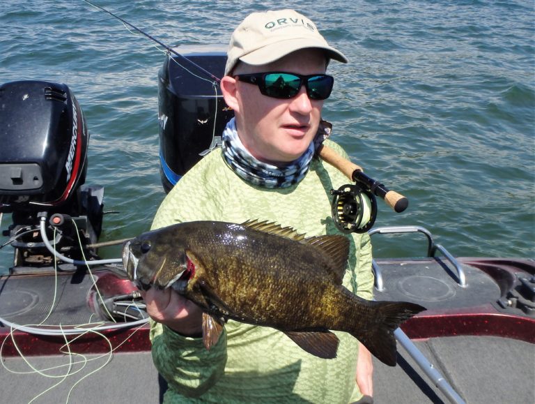After the action slowed from numerous fish being landed, I decided to switch them over to soft plastics. This should give them both several more bass with different presentations. I quick demonstration had me locked up on the very first cast, showing them that it definitely worked! Once again, they began hooking many more smallies from this same spot. This went on for a while and Neville decided to try his luck with a fly rod. I had brought a couple along and was sure he would be able to get into fish this way as well.