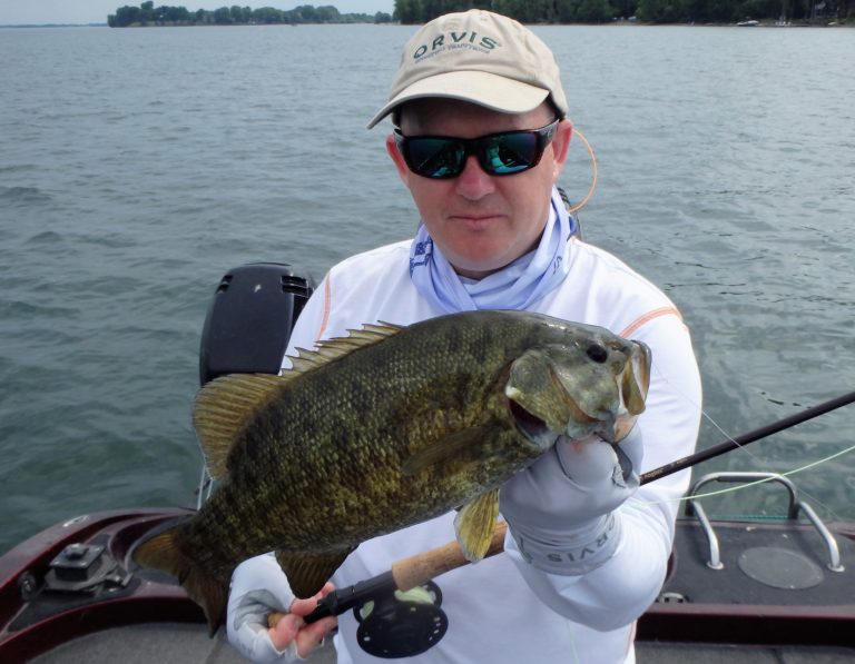 With time not on our side, I decided to hit one final area in hopes of hooking them up several more times. It was here that Neville finally got his wish as he managed to catch a couple of giant perch and one really nice smallie on the fly. Tony was still pounding fish but this time he was in the front of the boat with Neville fly fishing from the back. He needed more room and it was much safer too! I had wanted to end around 4:00 but the action was so good that we finally finished 30 minutes later.