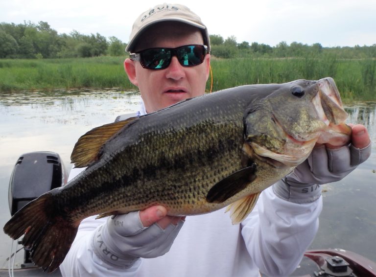 Prefrontal winds kicked up pretty good as we made our way into shallower water. This turned out not to be necessary as we found out soon after. We were all in rain gear and it barely sprinkled in the next 30 minutes. Eventually it passed and so did the wind, so I decided to have them fish the area we were in before leaving. I guess it was the right choice as two nice largemouth were landed. One was the regular way over the weeds but the other was a little bizarre. Neville had failed at skipping a bait under tree branches and actually was in the tree. When he tried to lift it out, a huge largemouth just grabbed the bait and took it down. I told him to keep pressure and used the electric motor to crash into the tree and rescue his catch. When I grabbed the fish I couldn’t believe how big it actually was. It was huge! Let’s just say he got lucky as anything could have happened.