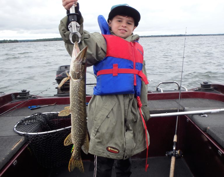Charlie was battling a fish that he didn’t seem to have much control over and I thought it had just become snagged. Cody already had his pike in and released! Soon after I knew what had happened and cleared the other two lines, giving him the whole boat to fight the fish. He was locked up on his very first lunge and I didn’t want him to lose it. Today was officially the season opener and I also wanted a few pics. As it neared the boat, they all freaked over the actual size of this beast! After a little difficulty landing it, I finally had her in the boat! Charlie was instructed on how to hold the fish and several quick pics were taken before releasing her back to the water. I made him hold the tail until she was ready and we all watched her swim off unharmed. No sense putting the lines in again, we were done!