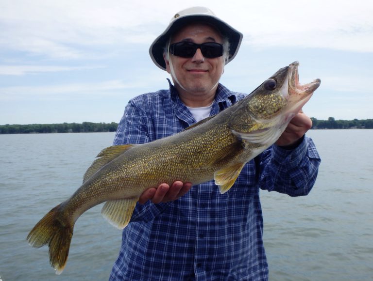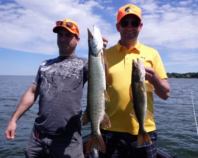 Within a minute after we started the troll, one of the down rods went off and Vlad had the first fish of their outing. Nobody was ready for such a quick hit and I was forced to remove it from the holder for him to fight. I could tell by how it was staying down that it was a walleye and confirmation was made boatside. I quickly netted it and several shots were taken before the release. Too big to keep! Within a couple of minutes after the first, a double was had and the other two also got to fight fish. They were absolutely shocked at how fast the action was and couldn’t believe their luck! Three fish in about as many minutes!