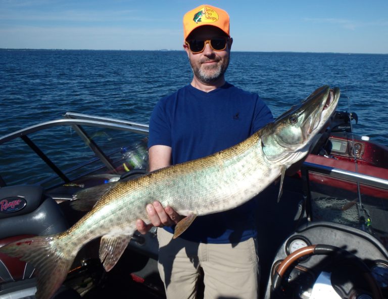 The afternoon went by quickly as we saw and we were running out of time. I really wanted to get them into something larger and in the last half hour, it happened. One of the down reels fired and it howled! I was pretty sure by the sound that it was another musky and pulled all the other lines as Jason did battle with his first. Although not a giant it was a decent fish! He fought it for a couple of minutes before I was able to get it in the net. We took several pics and then released it back to the water, continuing our troll. A few more fish were landed but none as big as the lunge. By 6:00 we were done and packed everything up and headed back.