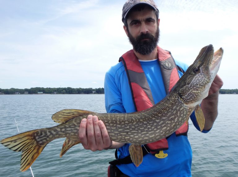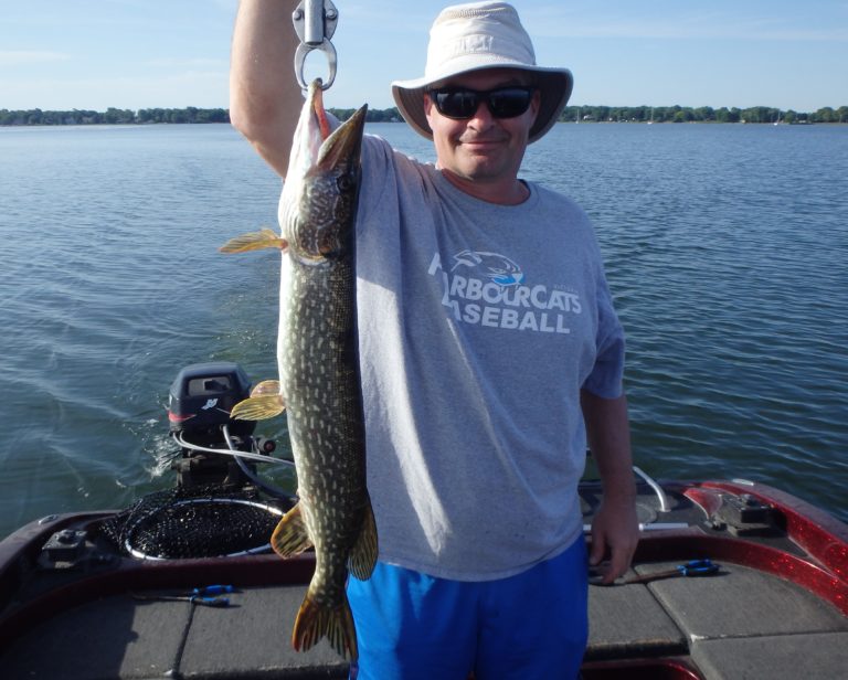 I had decided to go a little deeper and switched up baits, hoping to find some gold. First reel to go off went hard and it was the right species! Paolo brought in a good walleye but unfortunately it was 24 inches and had to be released after a few pics. I reset the lines, staying over deeper water and almost immediately got bit again. This time however, it was a northern, but larger than anything we had caught so far. I now had a pattern going and continued trolling the area picking up several other fish. A couple more walleye were landed with one of the two making it into the livewell. The other one was an over and returned again!