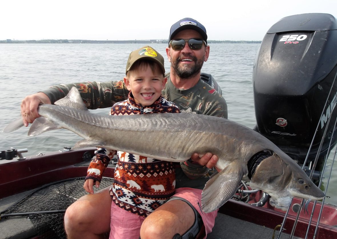 The winds had subsided slightly by late morning and I decided to give sturgeon a try. We moved to where I knew we’d have a chance and David hooked into one quickly. H fought it with the aid of George, or was it the other way around! They finally brought it to net and officially had their first ever dinosaur! Several pics before the release and off it went.