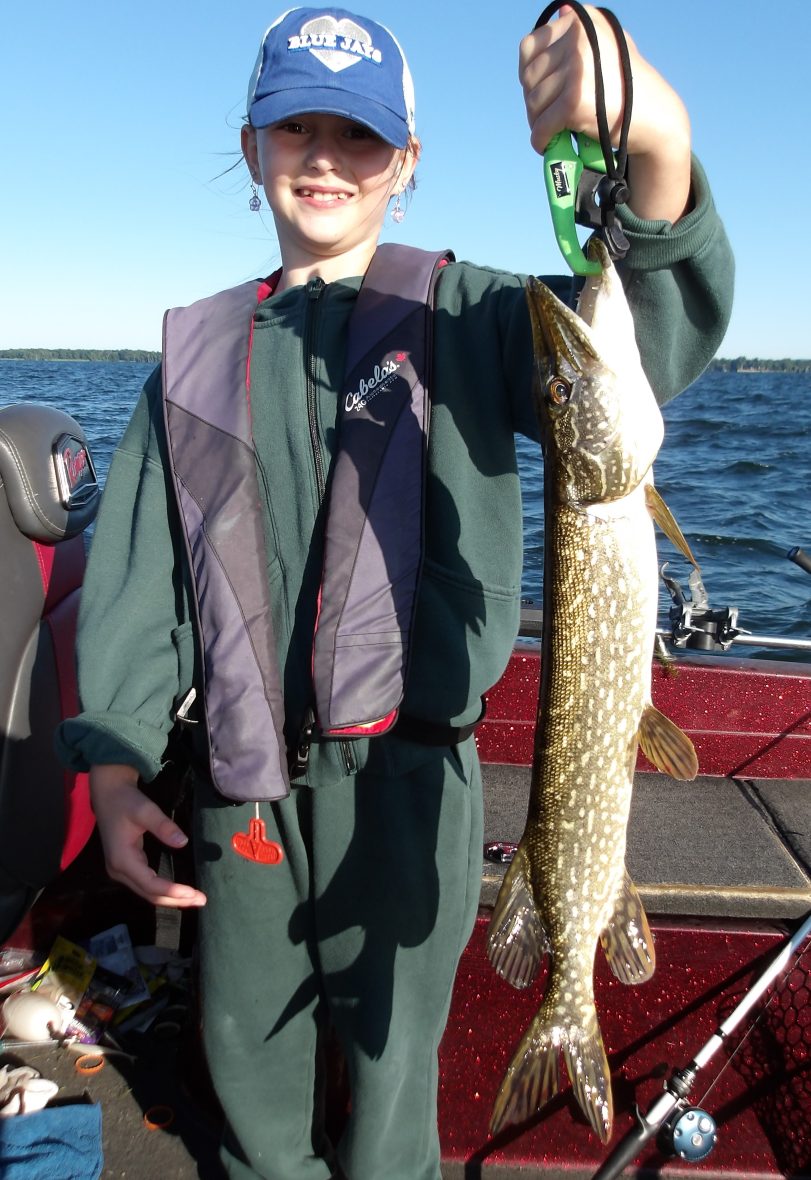 Jim, David and his daughter Elinor joined me this morning for a four-hour trip. We were unlucky enough to have another morning where the air temps dropped overnight, but I was sure we could still get bit. I began with a troll and only received a couple of bites in the hour we tried. At least Emily managed to land her first ever northern! I switched it up soon after and headed elsewhere to cast instead. I wasn’t wasting any more time trolling this area.